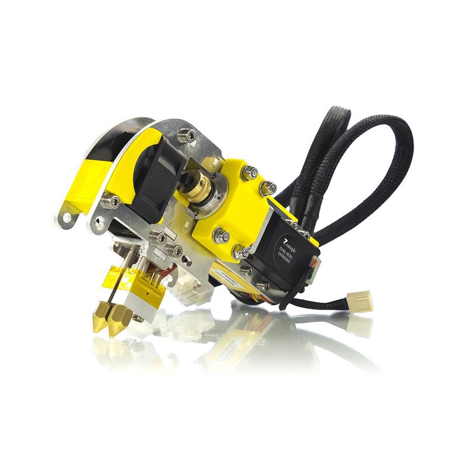 Der Extruder besitzt zwei unabhängige Stepper Motoren und zwei separat heizbare Düsen. Als Filament können Materialien mit einem Durchmesser von 1,75 mm eingesetzt werden.